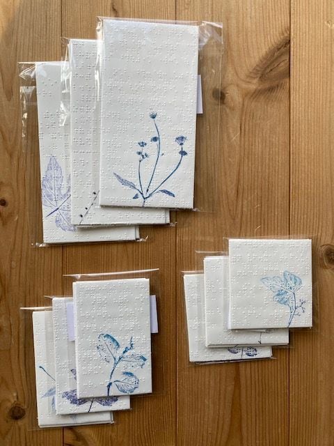 点字用紙をリサイクルして作った封筒です。本物の植物の葉をそのままスタンプ。葉脈の端々まで写し取っています。うしろの閉じ口のカタチにもこだわっています。1パックに3枚入っています。同型3枚×3パックで計9枚のセットです。たて・ポチ・ハーフよりお好きなかたちをお選びください。広報誌などに使用されていた点字用紙の、カット、折り、のり付け、封入まで。視覚に障害のある利用者さんが手作業で行っています。年末年始、お年玉、お祝い事などにもどうぞ。