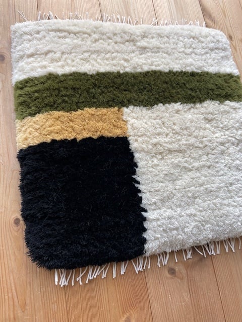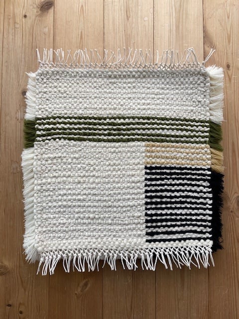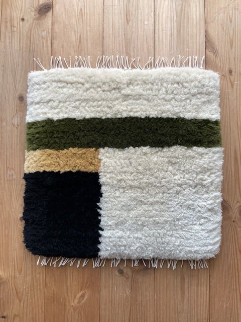 35×35㎝(実寸37×37)サイズのノッティング織りのチェアマット(椅子敷き)です。中央に抹茶色の5段ほどのライン。その左下側に黒とベージュ。残りの上部と右下側に白。みずのわ定番の幾何学模様のデザインです。
