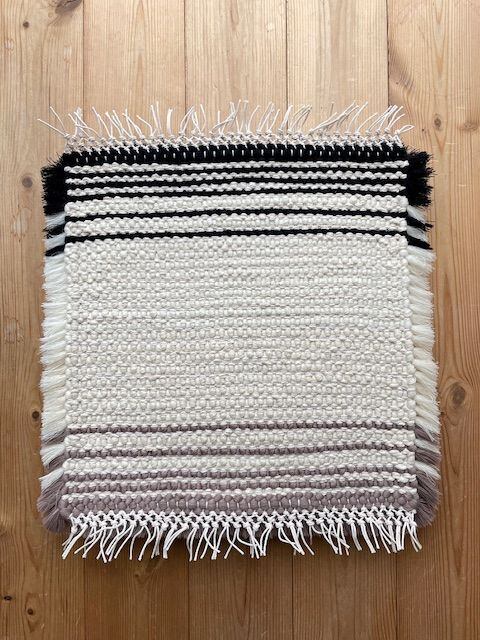 35×35㎝(実寸37×37)サイズのノッティング織りのチェアマット(椅子敷き)です。中央は17段ほど白。上部と下部は黒とベージュ色のボーダー(端は太め、中央に向かって細め)です。モノトーンで落ち着いた色合いなのでどんなシーンにもお使いいただけます。