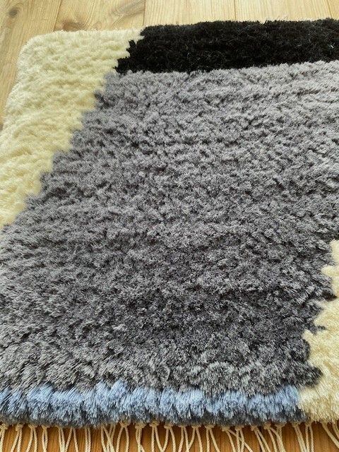 《視覚障碍者がつくる一点もののノッティング織りです。糸束のカットや、横糸の通しなども視覚障碍者が「できる限り」自らの手で行っています。飛び出したままの糸も、ちょっとゆがんだところも、味わいの一つと感じていただけますよう。よろしくお願いいたします》